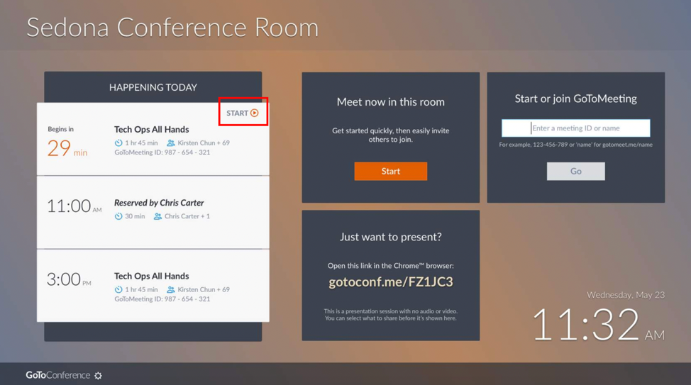 Running late to your meeting room? Blanking on your password? The last thing you need is a required meeting login slowing you down to get your meeting up and running in the conference room. Now, when you schedule a meeting through any of our calendar integrations, the meeting room will automatically be added as a co-organizer in GoToMeeting. This creates a one-click meeting start directly from the conference room screen. With GoToConference as your co-organizer, you don’t need to start the meeting from your computer anymore, you can just click the ‘Start’ button!
